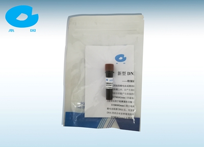 采用瓊脂糖電泳或聚丙烯酰胺電泳方法檢測雙鏈 DNA 時,SYBR®Green I 是最靈敏的熒光染料,當(dāng)其結(jié)合到核酸上時,會產(chǎn)生很強的熒光及高量子產(chǎn)額,DNA/SYBR®Green I 復(fù)合物的量子產(chǎn)額約為 0.8。由于與核酸結(jié)合后能產(chǎn)生很強的信號,背景極低,并且對核酸的親和力高,因此 SYBR 染料可在低濃度條件下使用。SYBR®Green I 的最低檢出限:20pg DNA(254nm);60pg DNA(300nm 紫外透射);此外,SYBR®Green I 還可以用于檢測寡核苷酸(1-2ng,300nm 紫外透射),比 EB 靈敏 20 至 100 倍。