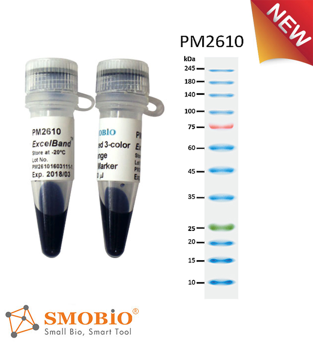 Under suggested conditions, the PM2610/PM2611 Enhanced 3-color High Range Protein Marker resolves 12 major bands in 15% SDS-PAGE (Tris-Glycine buffer) and after Western blotting to nitrocellulose membrane.